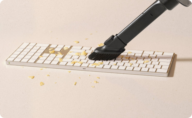 Gently dusts and sucks up scattered debris from hard surfaces such as keyboards and desktops.