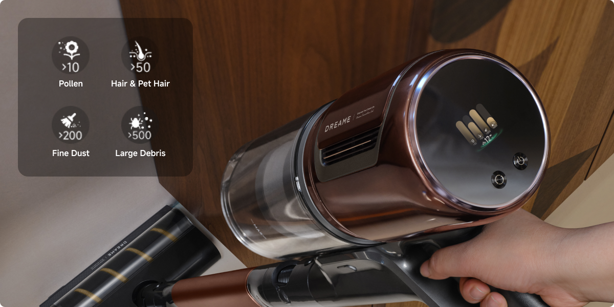 The five-layer filtration system, featuring an H14-grade HEPA filter, captures fine dust and particles (including pollen and pet dander) with up to 99.99% efficiency. It helps release cleaner air back into your home.