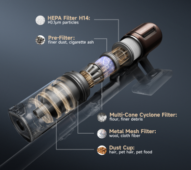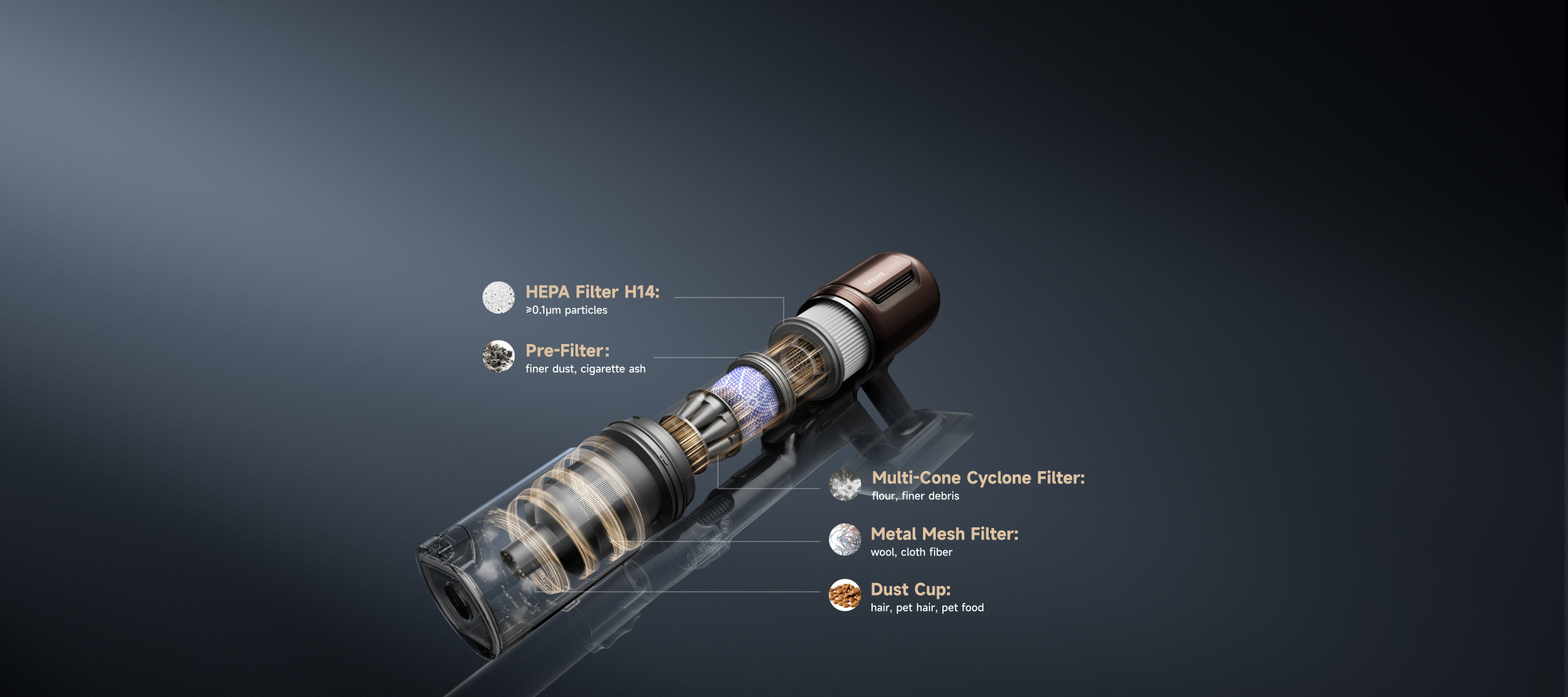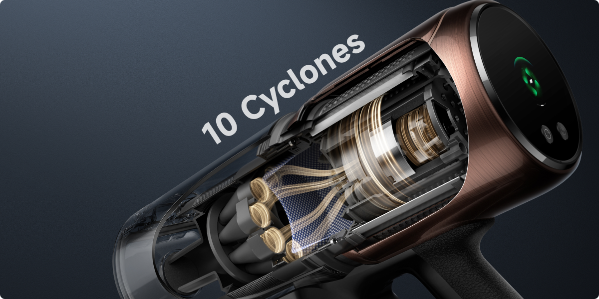 Advanced cyclone technology generates powerful centrifugal force to efficiently separate dust and prevent filter clogging—ensuring consistent, fade-free suction from start to finish.