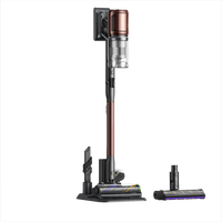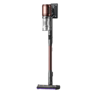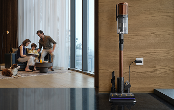 V30 charges while stored, ensuring it's always ready for use. The vacuum and accessories are securely housed on the base for easy access and organization.